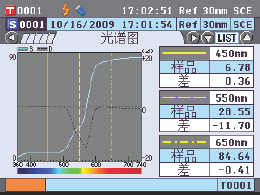 点测量按钮即可,CM-5宽大的彩色LCD屏幕会显示出测量结果,不仅如此还可以显示色度图、光谱曲线等这些以往只有通过电脑软件才可以进行显示的分析图表。